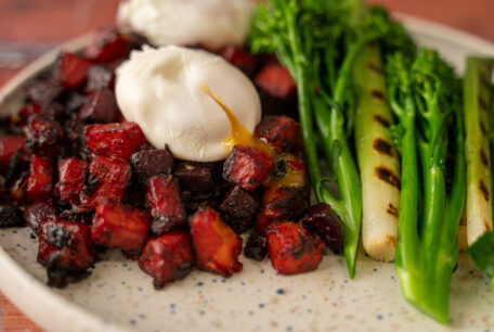 Beetroot and Sweet Potato Hash with Poached Eggs