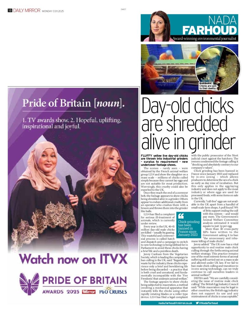 We were pleased to see more press coverage of the cruel practice of killing male chicks at birth in the Mirror. Recent evidence shows that French farms have been using industrial grinders to shred chicks alive. This practice is not generally carried out in the UK, but chick culling remains legal.